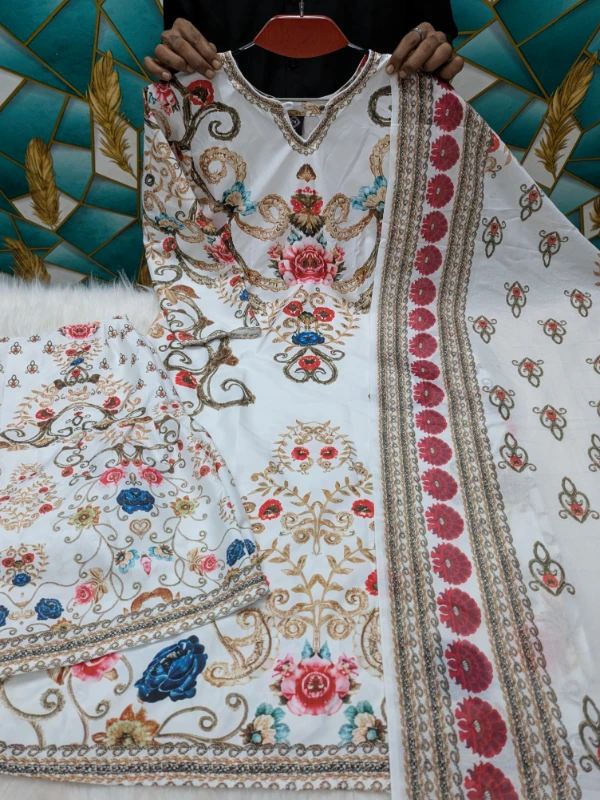 জামা: দুবাই সিল্ক ( ডিজিটাল প্রিন্ট করা এবং লেস/ টারসেল ওয়ার্ক) জামা: দুবাই সিল্ক সেলোয়ার : দুবাই সিল্ক ওরনা: হাফ জর্জেট ( ডিজিটাল প্রিন্ট ) ওরনা: ৫ হাত । প্লাজু লং- ৩৮ জামা লং - ৪০-৪৪ মধ্যে থাকবে লং বডি: ৩৬/৩৮/৪০/৪২/৪৪/৪৬
